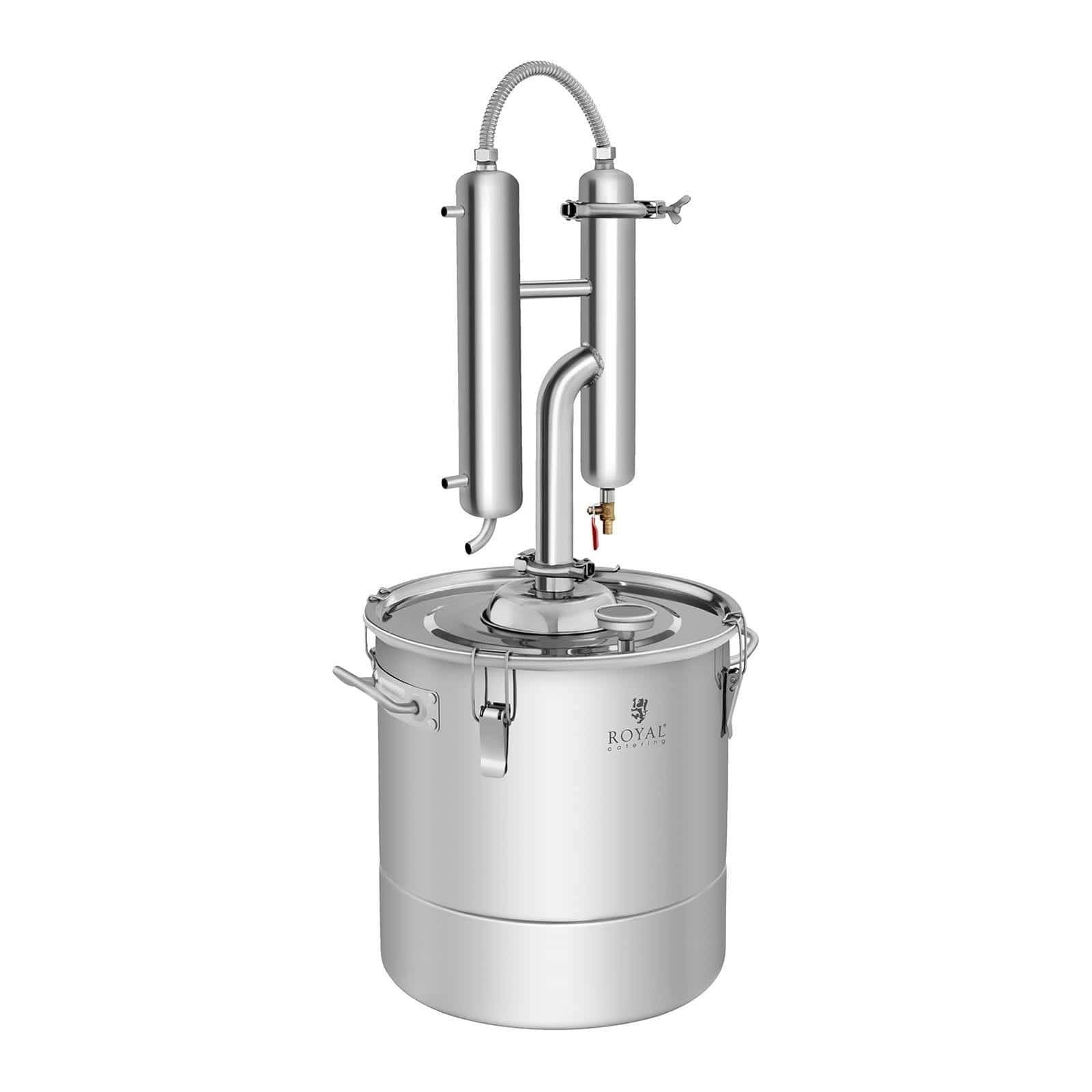 Distiliatorius tinka vandens ir hidrolatų distiliavimui. Su 30 litrų talpa galite distiliuoti didelius kiekius. Virdulys pagamintas iš specialaus storio nerūdijančio plieno. Siekiant gauti pageidaujamą kokybę, būtina stebėti temperatūrą. Dėl šios priežasties įdiegtas lengvai suprantamas analoginis termometras. Jis tiksliai rodo temperatūrą 0-150 ° C.