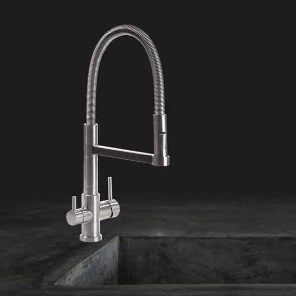 3 krypčių maišytuvas. Lankstus, pasiekia bet kurį stalviršio kampą. Poliruoto nerūdijančio plieno apdaila. Puikus srautas.